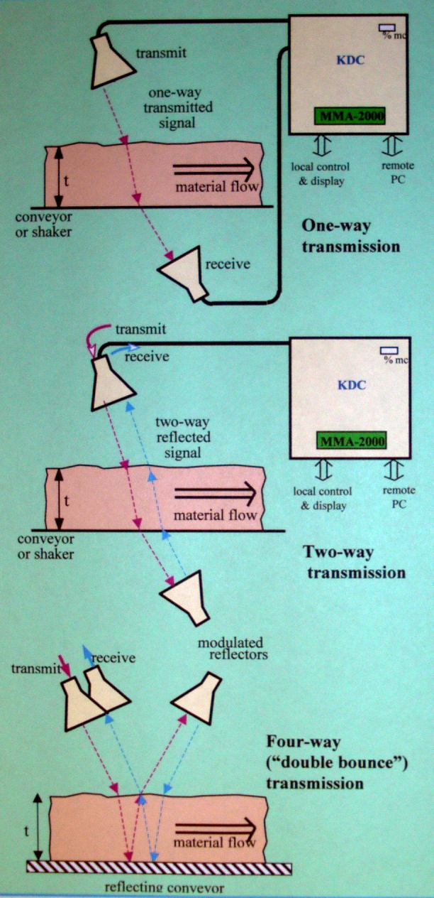 The MMA-2000 is a highly sensitive, non-contacting, two-parameter instrument in which a beam of low level microwave power is transmitted through a thickness of the test material. Three configurations are depicted below. The two measured parameters are the changes in signal absorption or attenuation (dA in dB), and the time or phase delay (df in deg) caused by passing the signal through the material.